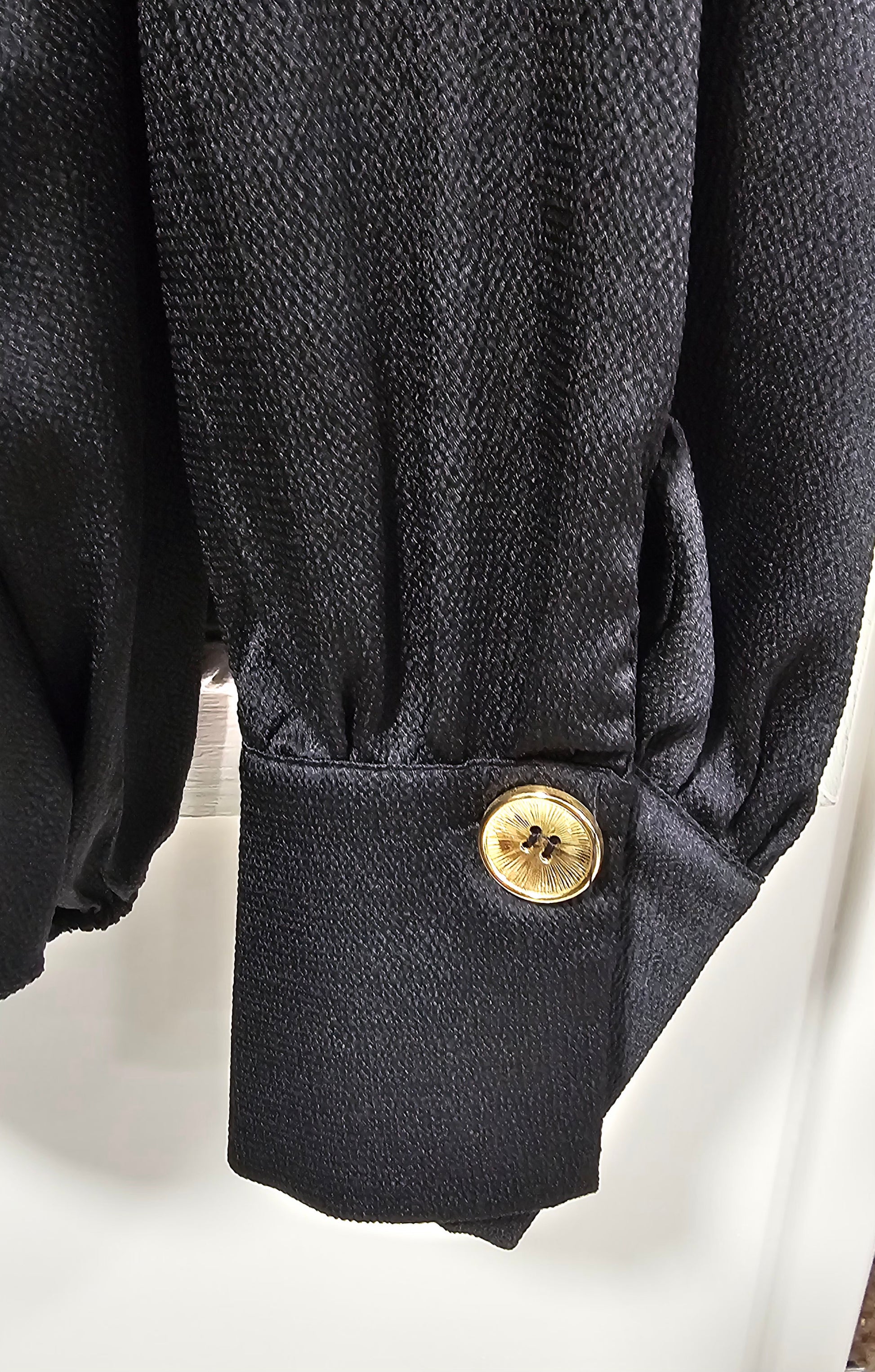 Esta blusa curvy de stilo ampio, de manga larga, tiene goma en el bajo para marcar cintura y las mangas fruncidaa en la parte inferior con puño de camisa y botones joya.