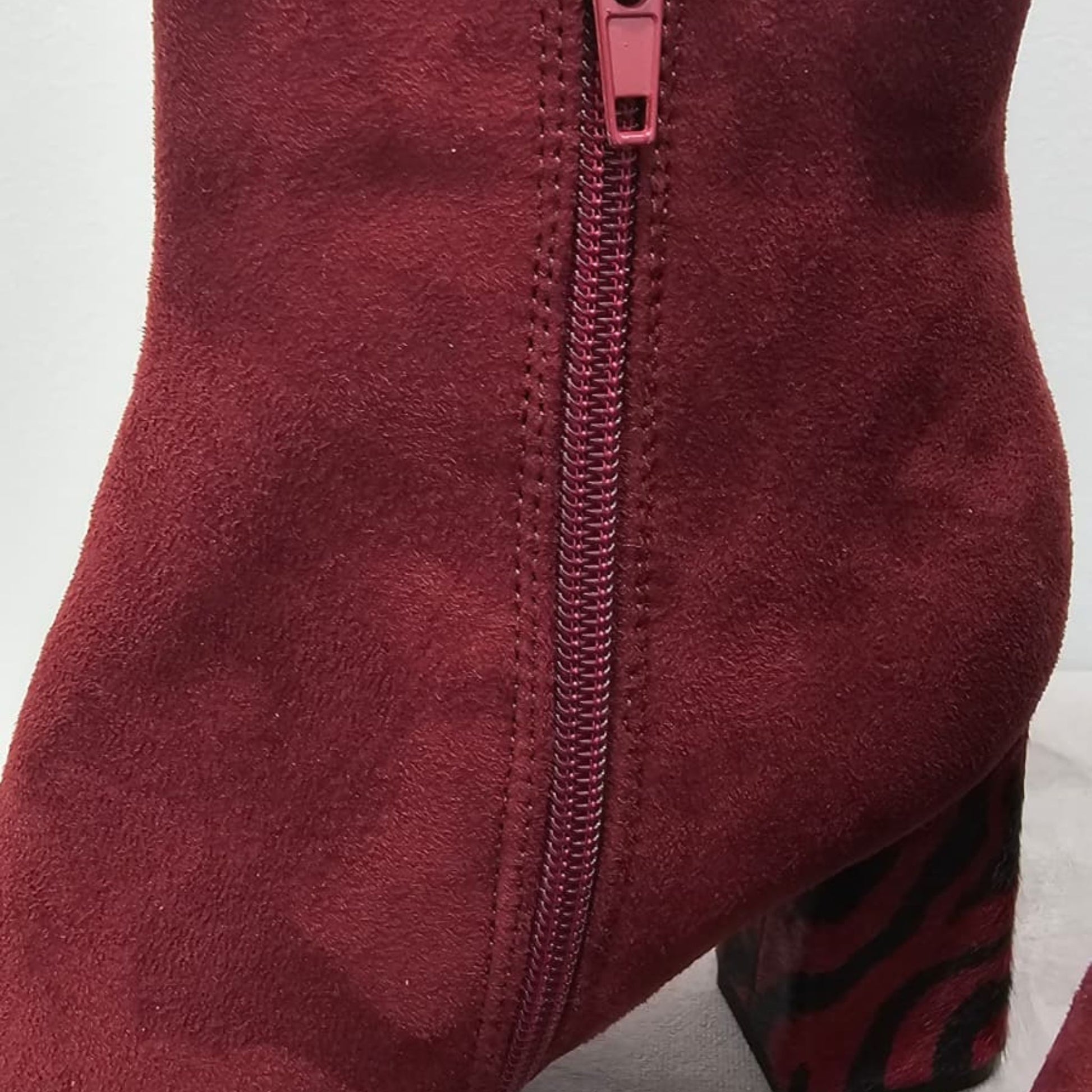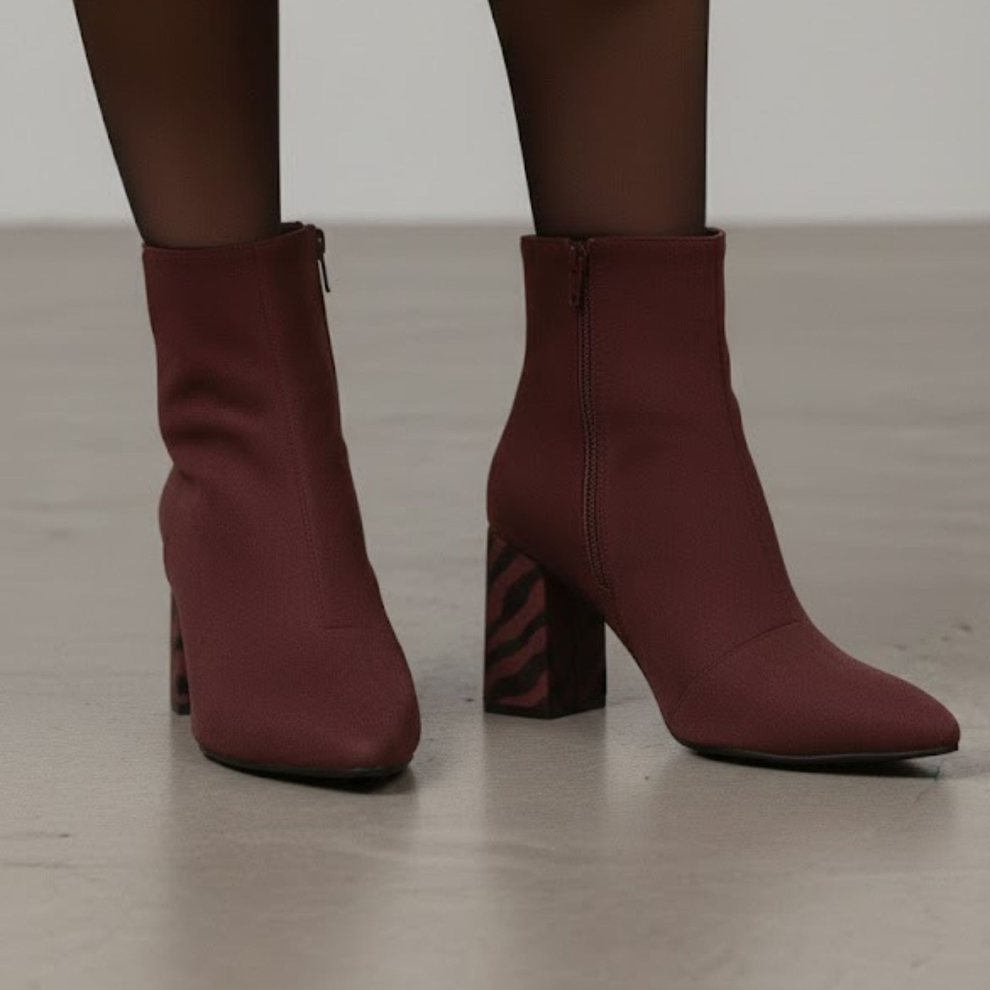 Aporta un toque de elegancia y originalidad a tus looks con estos botines burdeos de diseño italiano. Su acabado en tejido suave y su color intenso los convierten en el complemento perfecto para la temporada, mientras que el tacón ancho con estampado animal print añade un detalle moderno y sofisticado.