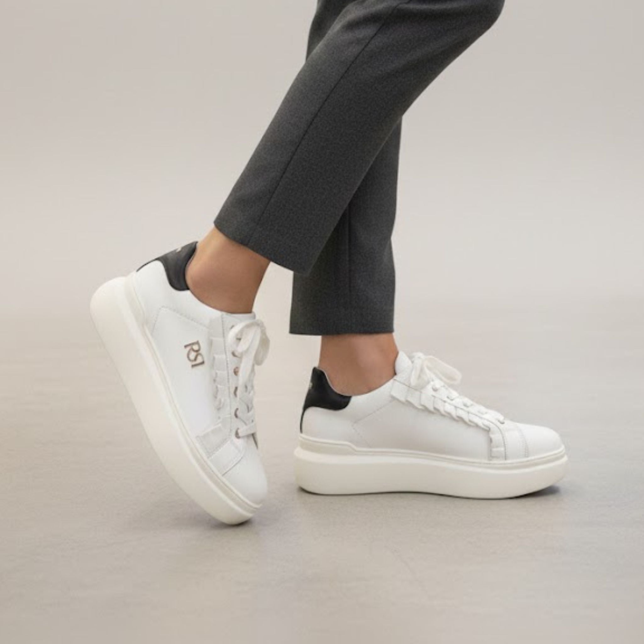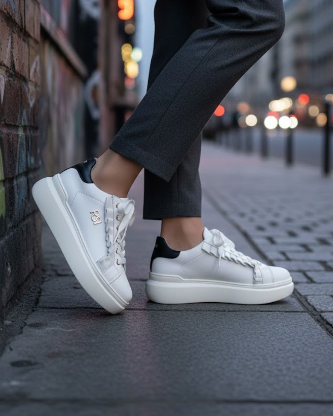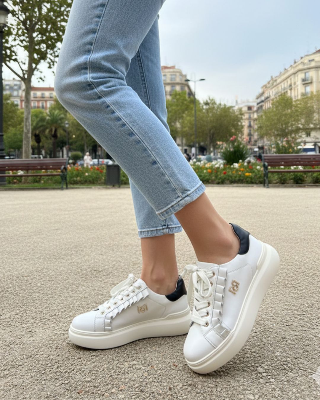 Estas bambas blancas de diseño italiano son el equilibrio perfecto entre elegancia y comodidad. Su silueta minimalista, realzada por el detalle negro en el talón, un volantes y el logo dorado lateral, las convierte en el complemento ideal para cualquier ocasión: desde un look casual chic hasta un conjunto sofisticado.