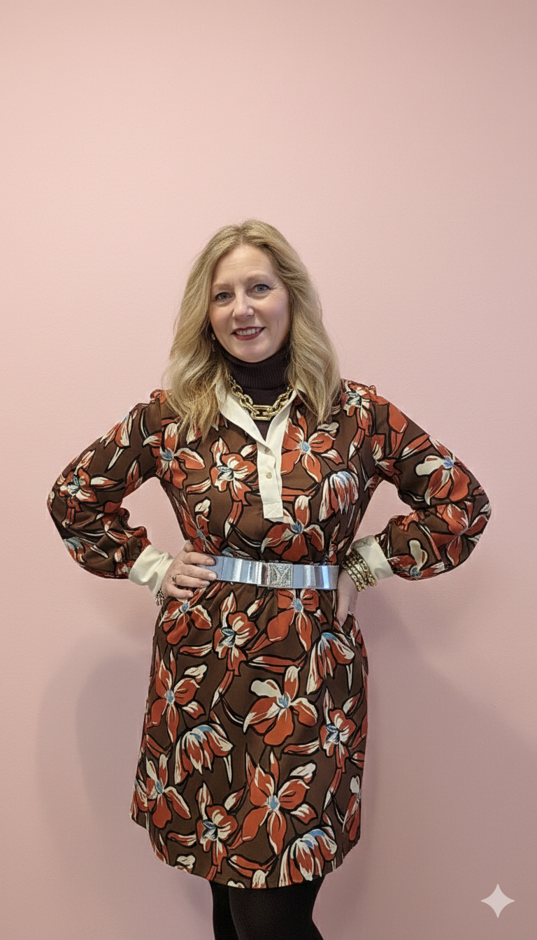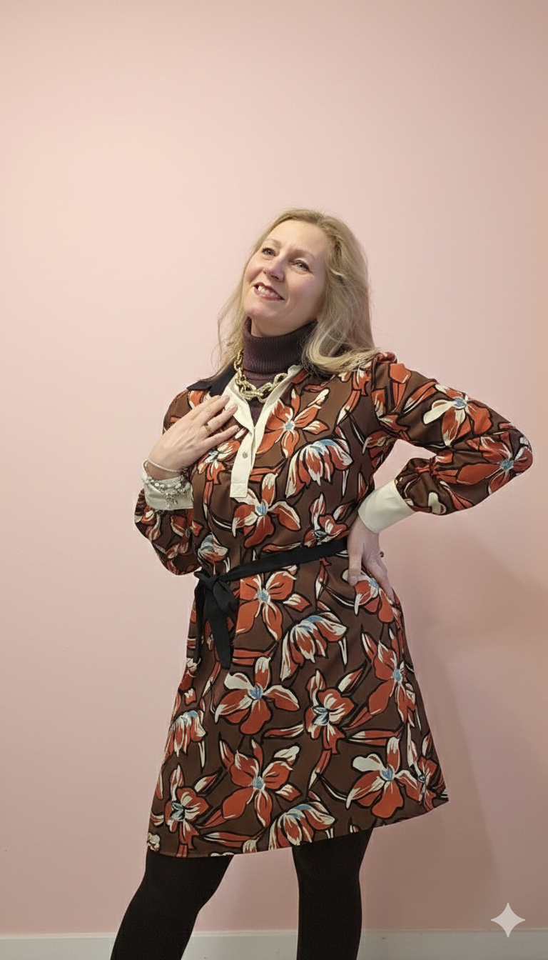 Luce la elegancia italiana con este vestido camisero de inspiración floral, en tonos tierra, teca y blanco. Su diseño combina un corte clásico y femenino con un estampado vibrante que aporta personalidad y frescura a tu look.