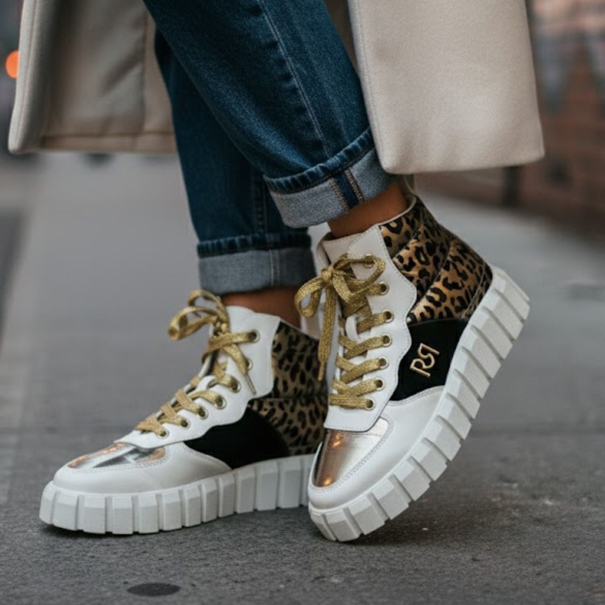 Atrévete a destacar con estas bambas urbanas de diseño italiano, que combinan el estilo sneaker con la silueta tipo botín. Su caña media cubre el tobillo, aportando un toque moderno y versátil, mientras que la mezcla de materiales —animal print, blanco, negro y detalles dorados— las convierte en el complemento perfecto para elevar cualquier look urbano.