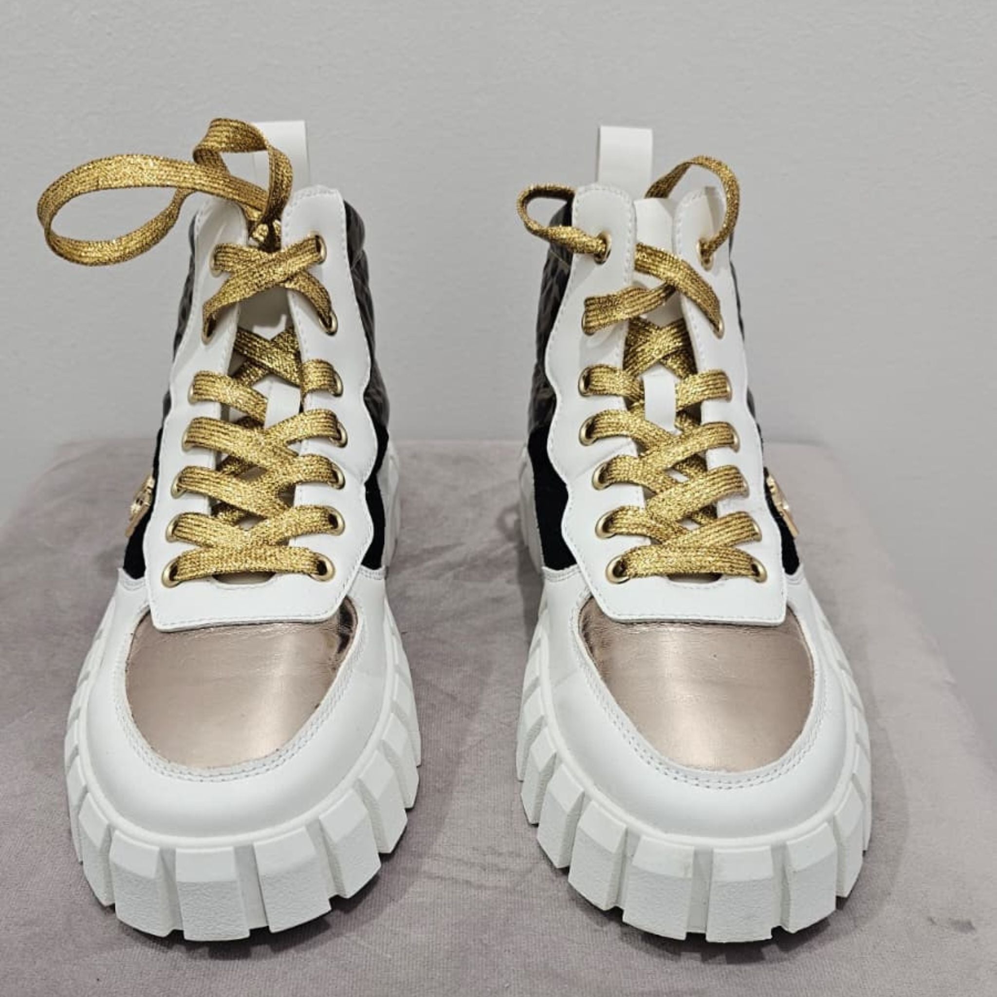 La suela gruesa y ligera garantiza máxima comodidad, y los cordones dorados añaden un brillo especial. Ideales para combinar con jeans, pantalones o vestidos, estas sneakers tipo botín son la opción ideal para mujeres que buscan moda, personalidad y confort en su día a día.
