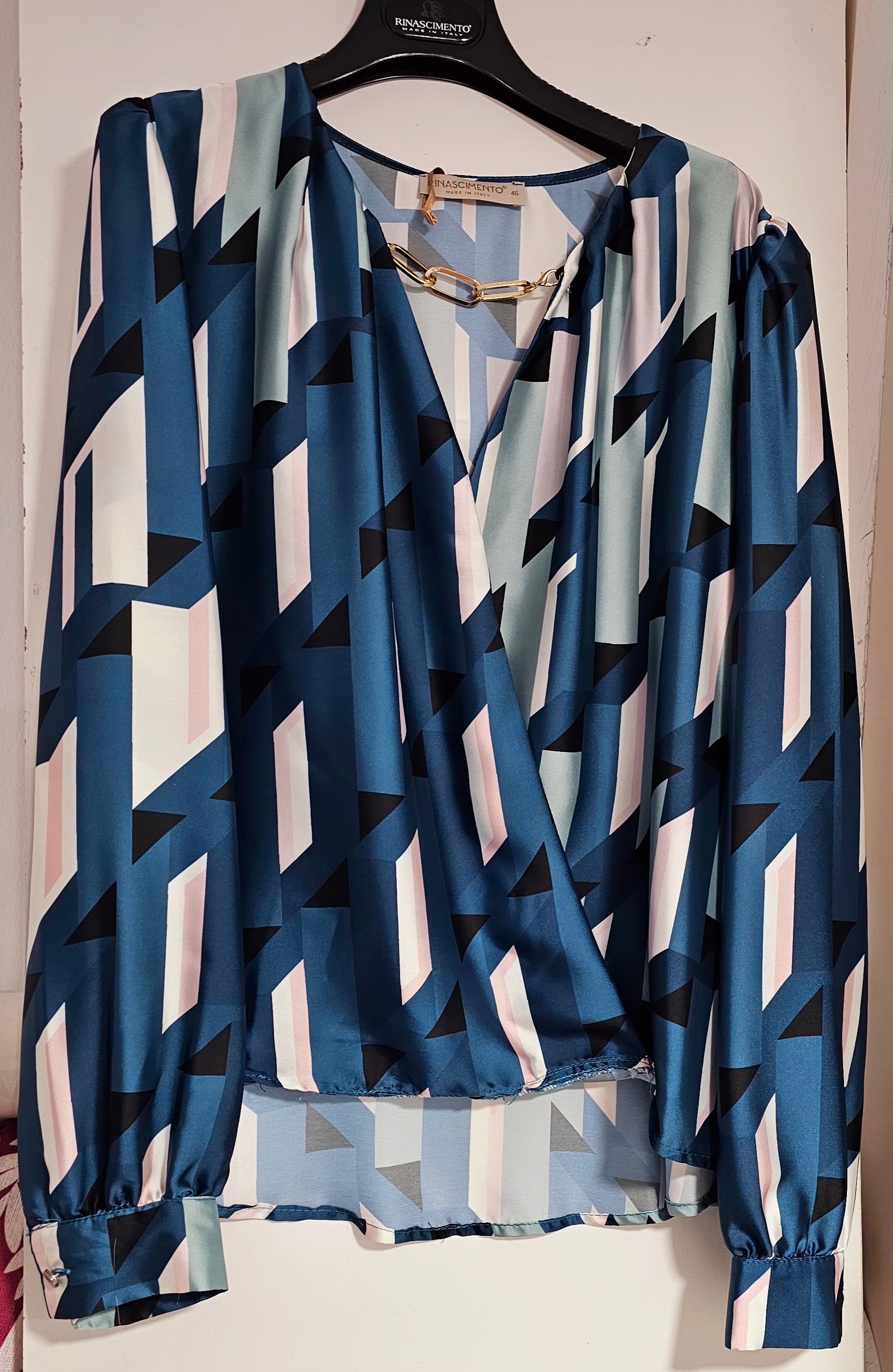 Esta blusa de Rinascimento es la combinación perfecta entre elegancia y modernidad. Su ajuste fluido, mangas abullonadas y estampado geométrico la convierten en una prenda imprescindible para la mujer curvy que busca un look refinado y versátil.